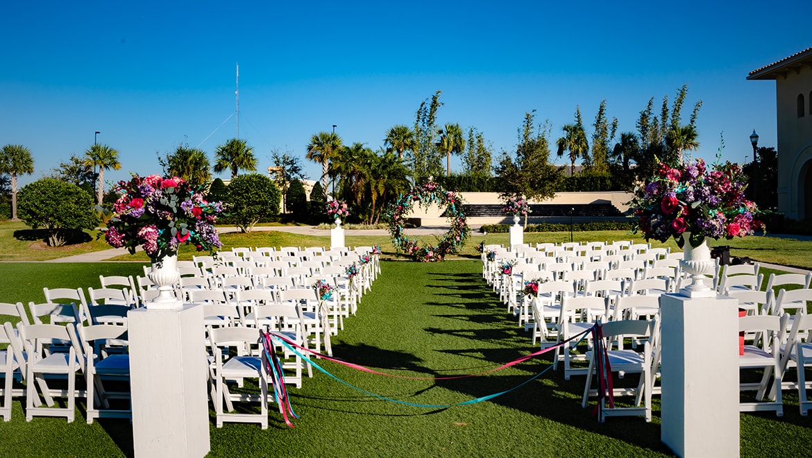 An outdoor wedding venue, the Ballroom Commons provides a beautiful Tuscan landscape as a backdrop for your ceremony or cocktail hour reception in Orlando. Square footage: 12,100 | Ceremony and Reception capacity: 600